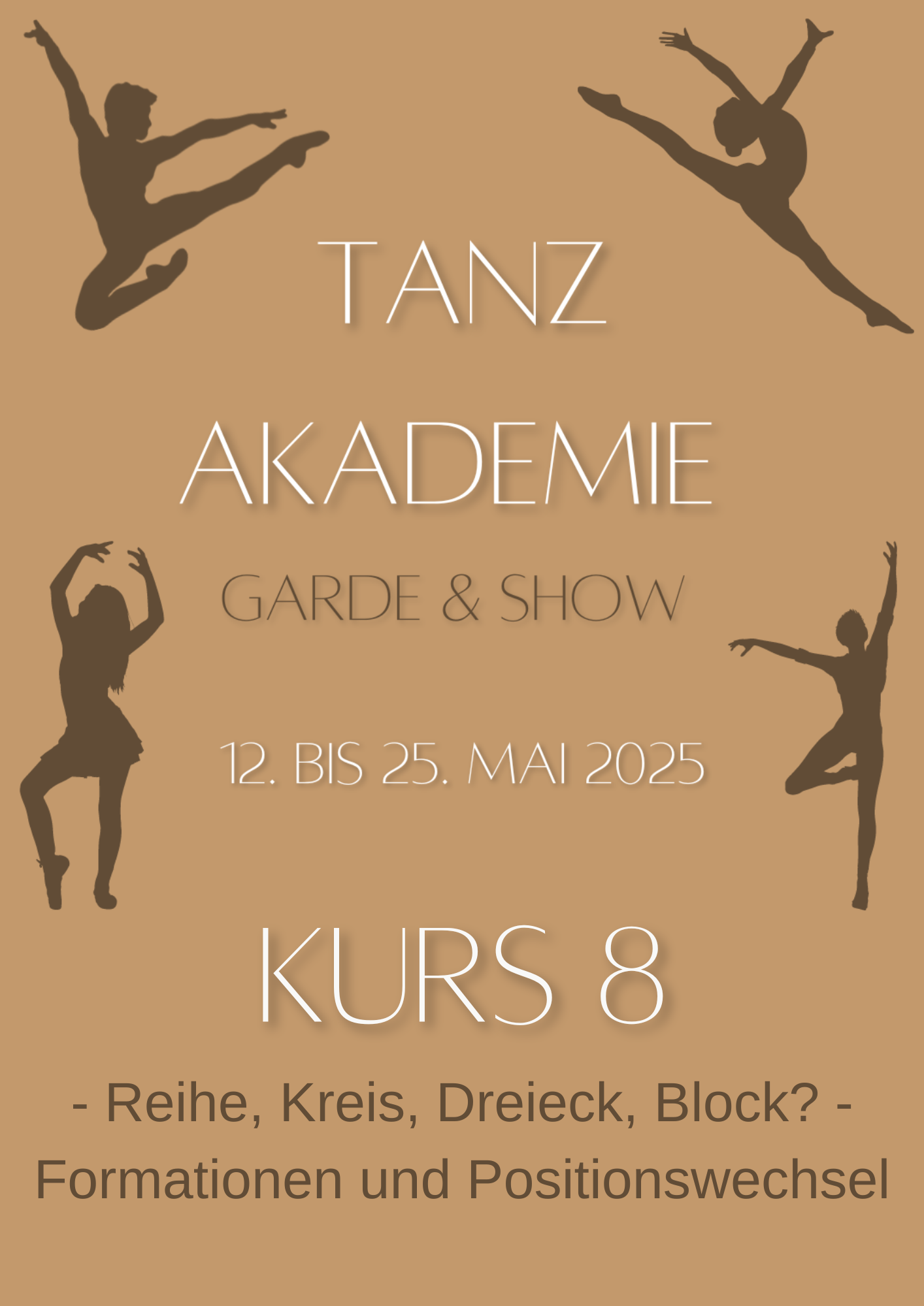 In diesem Kurs dreht sich alles rund ums Thema Formationen. Es gibt Hinweise zur sinnvollen Aufstellung von Formationen, effektvollen Positionswechseln und Aufteilung der Bühne. Die Tipps richten sich an kleine und große Gruppen, sowohl Garde- als auch Schautänze. Hier kann jeder noch etwas für sich mitnehmen und neue Inspiration sammeln.
